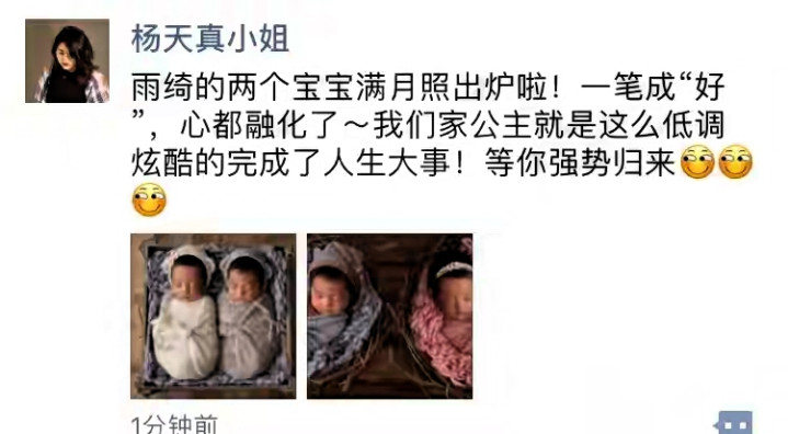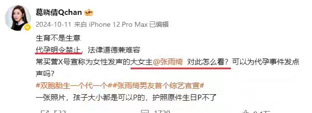 张雨绮这边,前经纪人杨天真晒出孕照,网上也流出她有妊娠纹的照片,证明她2017年确实怀过孕。但怀过孕不代表没有代生行为,面对葛晓倩的实锤,张雨绮方面始终拿不出有力的反驳证据,这事也一直悬而未决。